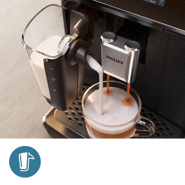 LatteGo je sustav za mlijeko koji se najbrže čisti jer ima samo 2 dijela, nema cijevi i može se očistiti za samo 10 sekundi ispiranjem pod mlazom vode ili u perilici posuđa. Philips ne nudi automatsko čišćenje jer zahtijeva dodatno čišćenje.