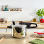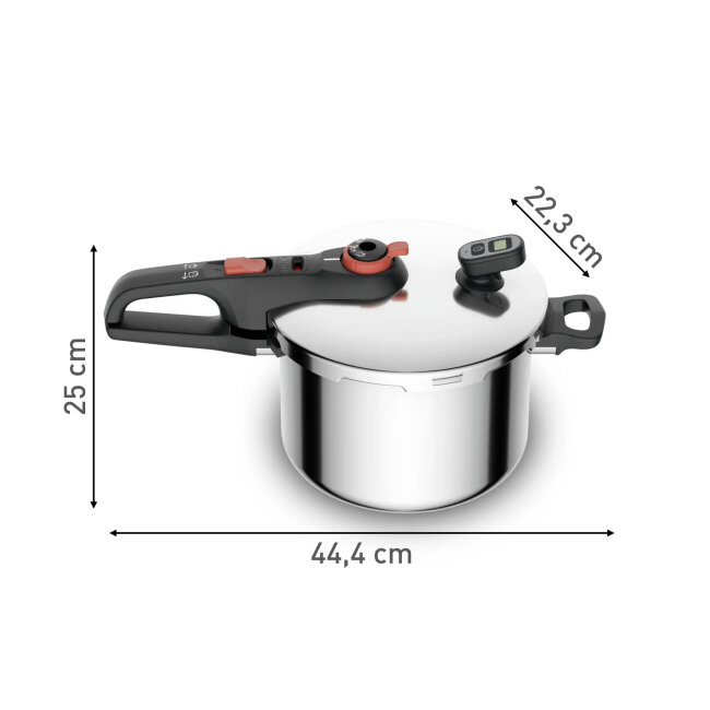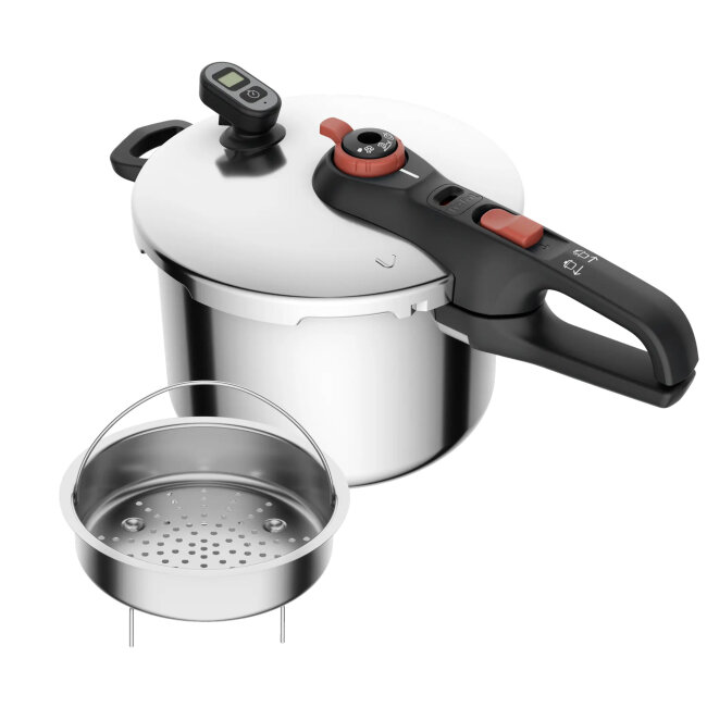 Nema više prekuhanih jela! Tefalov ekspres lonac Secure Chrono ima odvojivi tajmer koji možete nositi sa sobom bilo gdje u kući! Pripremite obroke do dva puta brže* i maksimalno iskoristite dva namjenska programa ekspres lonca za optimizaciju procesa kuhanja—jedan za povrće koje pršti hranjivim tvarima, a drugi za mekano meso spremno za tren. Napravljen da traje, Secure Chrono opremljen je sigurnosnim sistemom u 5 tačaka za potpunu sigurnost i potpuno je kompatibilan sa svim pločama za kuhanje, uključujući indukciju.