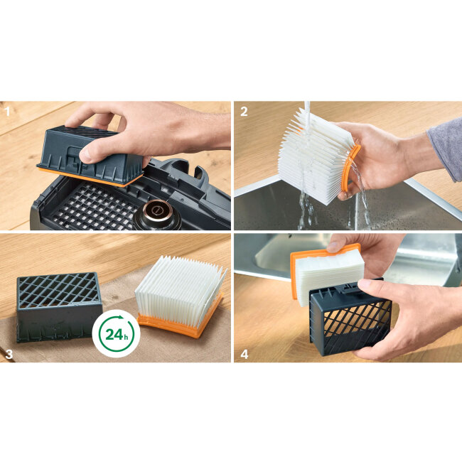 Mnogi usisavači gube usisnu snagu kada se vrećica napuni. Sustav PowerProtect jamči da se G ALL vrećica za prašinu učinkovito otvara te ima viši kapacitet za sakupljanje prašine sa svojim višeslojnim, visoko tehnološkim materijalom filtra. Dugotrajna učinkovitost za rijeđu zamjenu vrećice za prašinu.